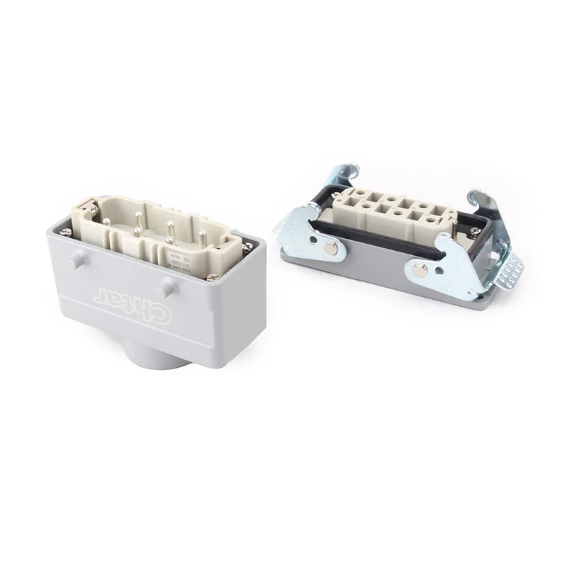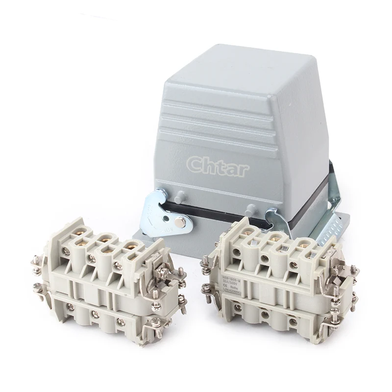 35A 6 पिन इन्सर्ट हेवी ड्यूटी कनेक्टर हेवी ड्यूटी कनेक्टरचे H16B ॲल्युमिनियम हाउसिंग काम केले आहे. हे स्ट्रेंथ पीसी मटेरियल आणि ब्रास सिल्व्हर-प्लेटेडपासून बनवलेले आहे .CHTAR ब्रास पिन चांगल्या दर्जाच्या आणि चांगल्या इलेक्ट्रिकल कंडक्टिविटीच्या चांदीने मढवल्या जातात. हे चांगले जलरोधक वैशिष्ट्य बनविण्यासाठी त्यात सील रबर आहे.
