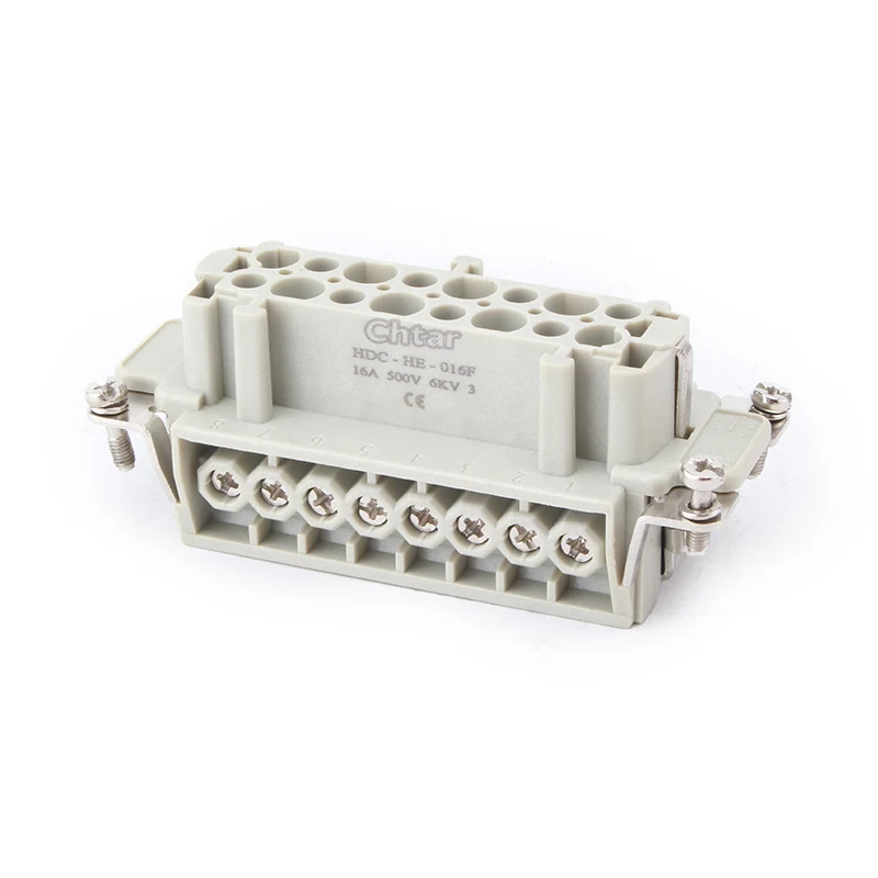 CHTAR चा प्रगत 16A HE-016-F/M प्लग-इन हेवी-ड्यूटी कनेक्टर एक M/F 16 पिन इन्सर्ट हेवी ड्यूटी कनेक्टर आहे. त्यात नर आणि मादी भाग असतात. हे H16B शेल हेवी-ड्यूटी कनेक्टरशी सुसंगत आहे. सामान्यतः, पुरुष घटक पुरुष गृहनिर्माण मध्ये एकत्र केला जातो, किंवा ग्राहकांच्या गरजेनुसार रिव्हर्स इंस्टॉलेशनसाठी ते महिला घटकामध्ये एकत्र केले जाऊ शकते. मजबूत पीसी केसिंग मटेरियल आणि सिल्व्हर प्लेटेड ब्रास पिन M/F 16 पिन प्लग-इन हेवी-ड्यूटी कनेक्टरची चालकता आणि ऑपरेशनल फायदे सुनिश्चित करतात.